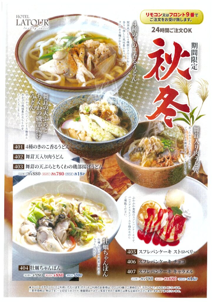 期間限定メニュー 【秋冬限定メニュースタート】 現在秋冬限定メニューを実施しております。きのこ・天ぷら・牡蠣が乗ったあったかメニュー、パンケーキのデザートをご用意しております!ご来店の際、是非ご賞味ください。