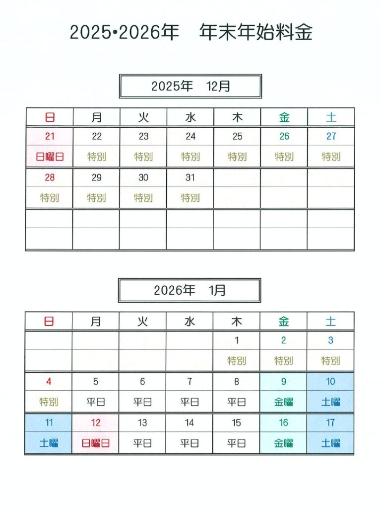 12月22日(月) 〜 1月4日(日) の期間は特別料金とさせていただきます。